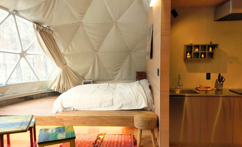 ドーム型テントは直径7mで、コンクリート基礎のしっかりとしたつくりになっています。冬は床冷えが抑えられ、室内はエアコンで温度が安定。四季を通じて快適に滞在できる仕様です。あえてテレビは置かず、アンティーク家具に囲まれた空間で本を読んだり、会話を楽しんだりと、それぞれのペースでくつろげるようになっています。