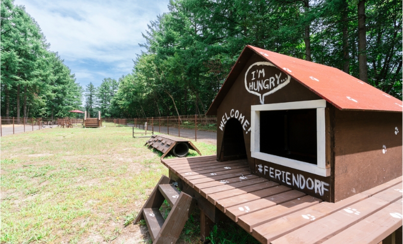 敷地内には約800㎡の広大なドッグランがあり、木製アジリティ遊具やフォトスポットも設置。森の散歩道も整備されており、愛犬とのんびり自然を楽しめる環境が整っています。宿泊者には鹿肉ジャーキーやトイレシーツなどの専用アメニティも提供され、ペットの受け入れ体制の充実度はトップクラスです。