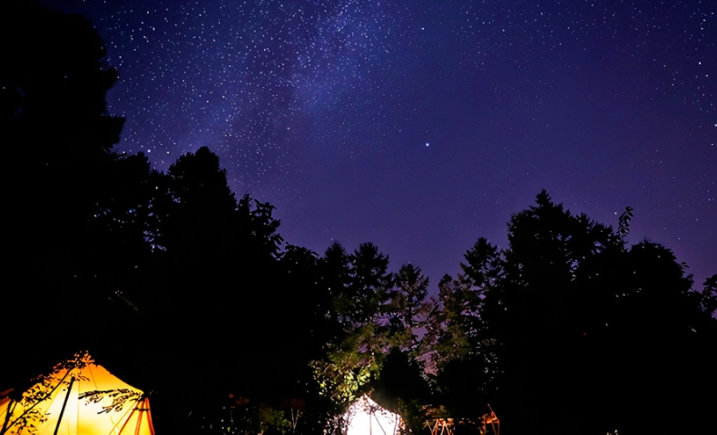 日が暮れたあとはアウトドアチェアに腰掛け、澄んだ空気のなかで満天の星空を見上げる静かな時間が待っています。走って遊ぶ時間とただ寄り添って空を眺める時間。グランピングならそのどちらも味わえます。