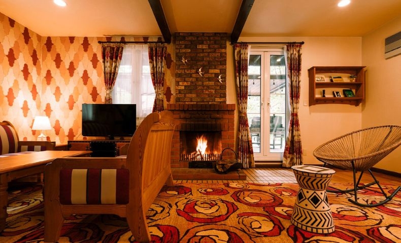 暖炉を備えた各コテージは、壁紙や家具に至るまで丁寧に設えられ、冬の訪れとともに一層温かみが増すくつろぎの空間へ。雪景色の中で揺れる炎を眺めながら過ごす時間は、ここでしか味わえない冬の贅沢です。