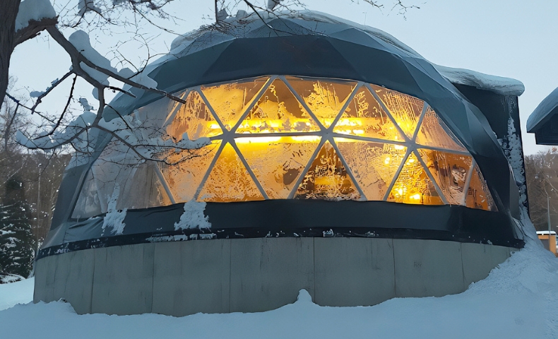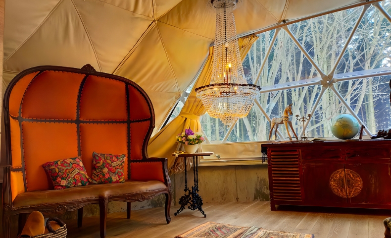北海道・長沼町の「villa福座」は、雪深い森の中で「静を楽しむこと」を目的に設計されたグランピング施設です。ドーム型テントは冷暖房完備で、寒い季節でも驚くほど快適。